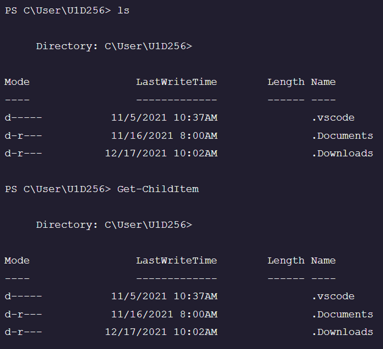 Trong PowerShell, Aliases cung cấp một tên thay thế để chạy lệnh cmdlet. Có một số bí danh viết tắt được tích hợp sẵn. Ví dụ: lệnh ls sẽ tạo ra kết quả tương tự như lệnh Get-ChildItem.