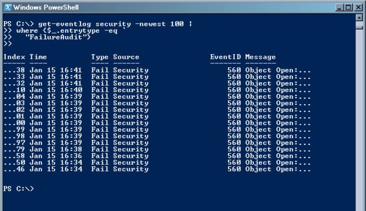 PowerShell thực sự có thể được sử dụng để phân tích các nhật ký sự kiện hiện có trong hệ thống của bạn. Mặc dù có một số cách để thực hiện quy trình này, nhưng cách tốt nhất cho lệnh cụ thể này là chỉ cần cung cấp lệnh –Log kèm theo tên tệp nhật ký. Ví dụ: bạn có thể sử dụng các lệnh như Get–EventLog –Log “Application” để xem nhật ký ứng dụng. Sau đó, bạn cần lọc kết quả đầu ra và xác định xem hệ thống của bạn có an toàn hay không.