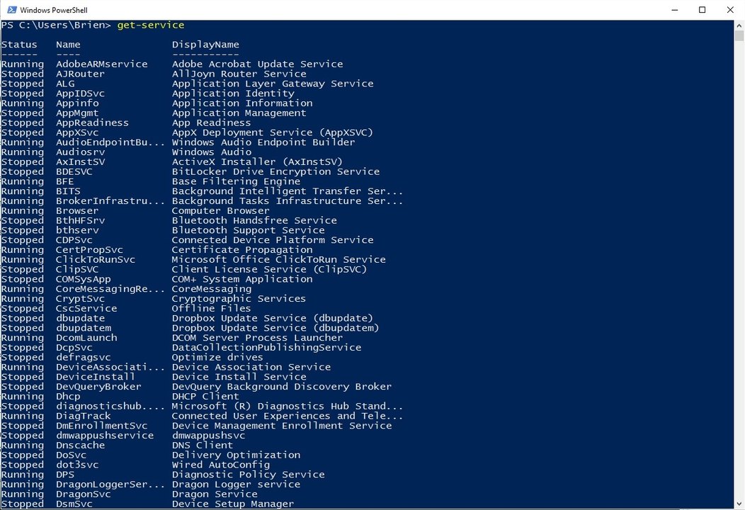 Khi bạn nhập lệnh này, nó sẽ hiển thị danh sách tất cả các dịch vụ hiện đang được cài đặt trên hệ thống của bạn. Nếu bạn cho rằng một dịch vụ cụ thể nào đó đáng để kiểm tra về mặt bảo mật, bạn có thể thêm lệnh "–Name" vào cùng với tên dịch vụ. Bạn được phép sử dụng ký tự đại diện. Sau khi hoàn tất, Windows sẽ hiển thị trạng thái của dịch vụ đó.