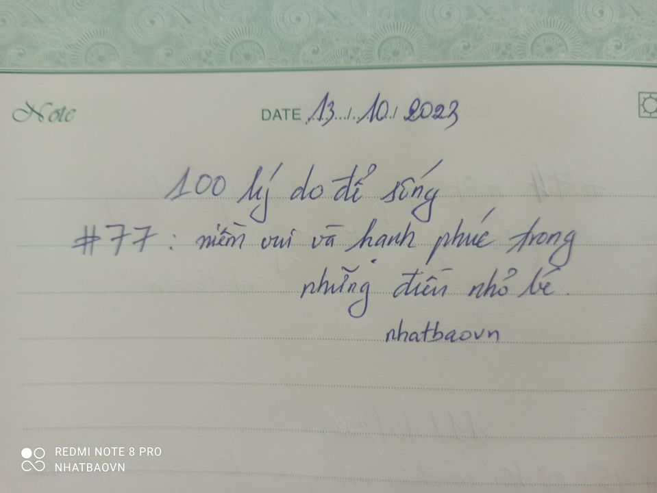 Lý do thứ 77 của Rezy trong 100 lý do để sống là “Joy and happiness in the little things”. Mình thích việc phân chia “joy” (niềm vui) và “happiness” (hạnh phúc). Không phải joy là cái gì đó trần tục và hạnh phúc là cao quý, mà với mình joy là cảm xúc, còn hạnh phúc là một trạng thái.