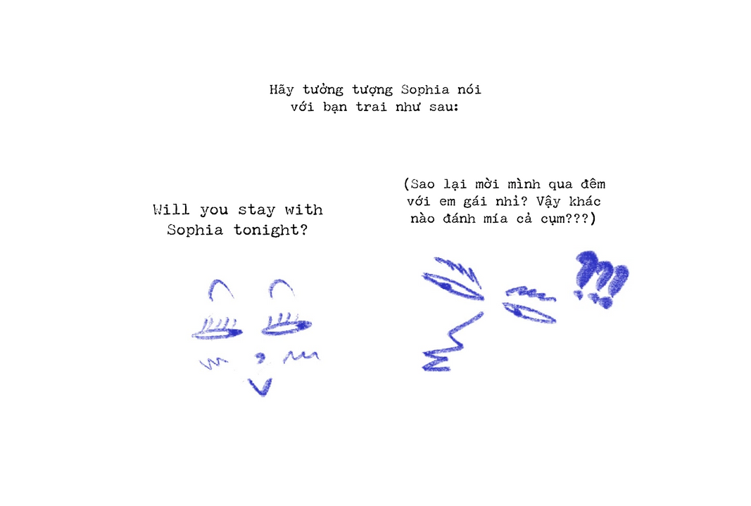 Lan nói: “Nếu duyên không thành, Điệp ơi, Lan cắt tóc quên đời vì anh…” Nghe bình thường đúng không? Thử dịch ra tiếng Anh: “If we can’t be together, Diep, Lan will get a haircut and leave everything behind for you…”. Bạn nhận ra chưa? Câu này trong tiếng Anh nghĩa là, một con Đào nào đó nói: “Điệp, nếu tôi và anh không cưới nhau, thì con Lan nó sẽ cắt tóc quên đời đó…” (???). Bởi việc chính người nói xưng tên (Lan xưng Lan), là một điều phổ biến trong tiếng Việt — kể cả giữa những người không thân lắm — nhưng nó rất hiếm trong giao tiếp công cộng trên toàn thế giới, thậm chí ở Nhật và Trung Quốc, vì kỳ cục và dễ hiểu lầm.