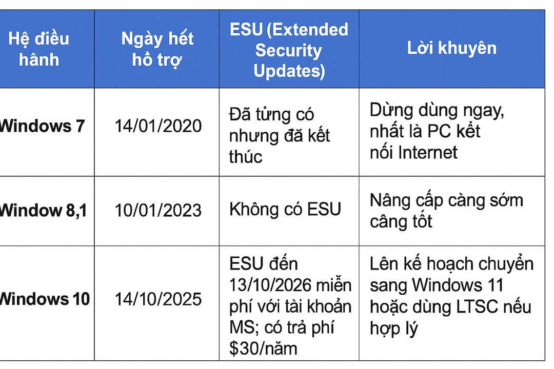 Windows 7 và 8.1 đã từ lâu “nghỉ hưu” – bạn không nên tiếp tục dùng vì quá nguy hiểm. Còn Windows 10, còn một chút thời gian (đến 14/10/2025); nếu muốn kéo dài thêm, hãy tận dụng ESU, tốt nhất là tiến tới Windows 11 để đảm bảo an toàn lâu dài. Với doanh nghiệp, hãy bắt đầu lên kế hoạch chuyển đổi càng sớm càng tốt để tránh lỡ chuyến tàu hỗ trợ bảo mật.