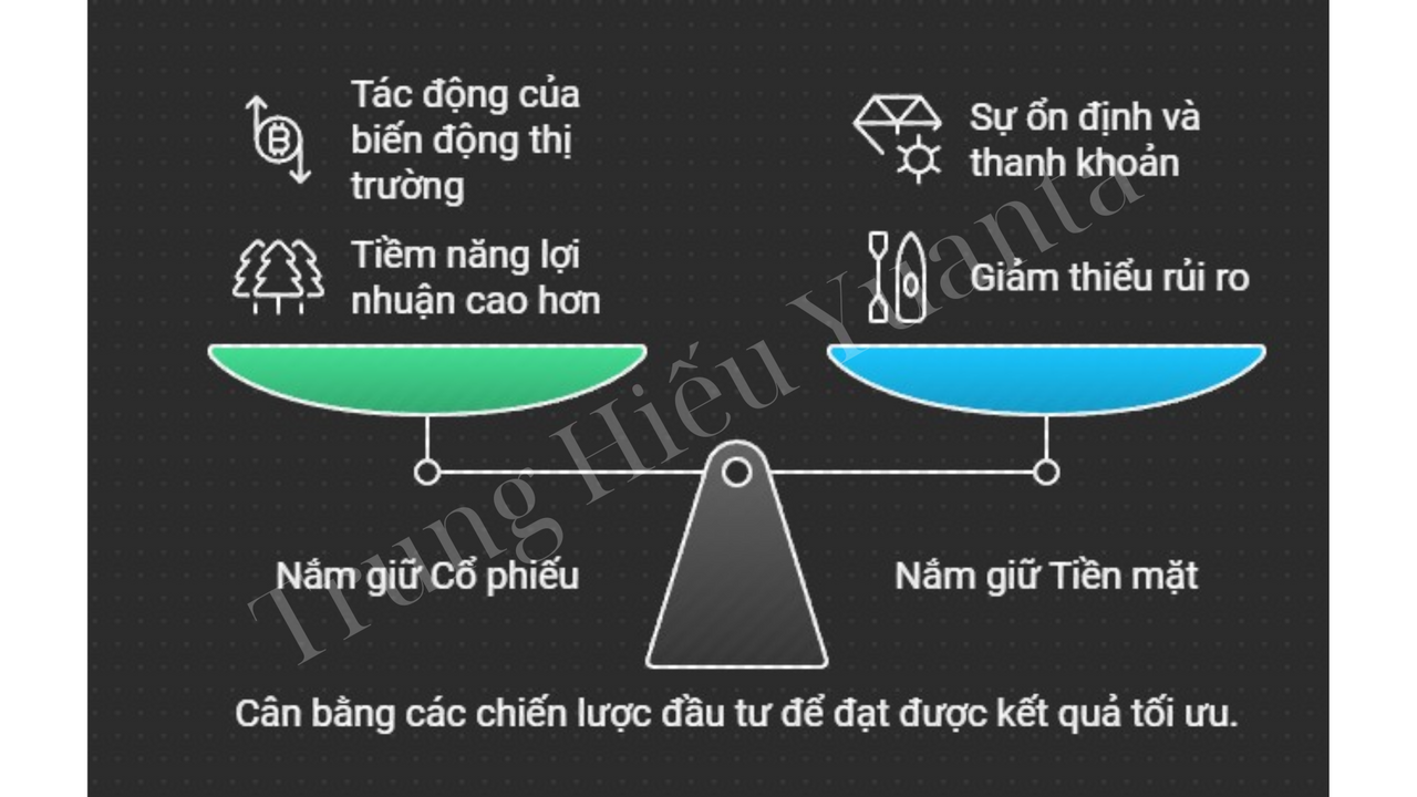 + Mỗi lựa chọn đều có ưu thế riêng. Khi nắm giữ cổ phiếu, bạn có lợi thế khi thị trường tăng giá. Nhưng khi giữ tiền mặt, bạn lại có sự linh hoạt để tận dụng cơ hội khi giá giảm.