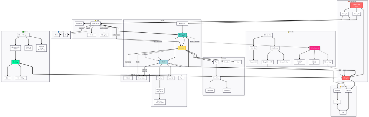 Tất cả những câu hỏi dưới đây xuất hiện trong đầu mình dưới dạng một hệ thống mạng lưới (Mesh) đồng thời. Mình đã buộc AI phải "duỗi thẳng" nó ra theo một mạch logic tuyến tính để những bộ não quen đọc "mì ăn liền" cũng có thể tiêu hóa được.