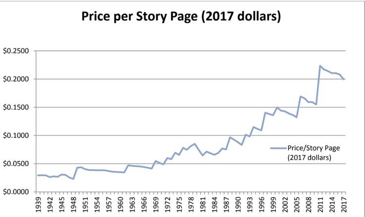 Hai hãng Marvel và DC Comics đã là đối thủ của nhau trong mảng kinh doanh truyện tranh kể từ thập niên 30. Giá trung bình của một bộ truyện của DC dao động từ 2.99$ - 4.99$ (khoảng 22 trang màu), còn biểu đồ dưới đây là giá một trang của Marvel theo từng năm: