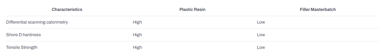 Ngược lại với chất độn có thể khác nhau về màu sắc, độ đục và độ bóng tùy thuộc vào thành phần sản xuất, hạt nhựa có màu trong hoặc trắng và không chứa chất gây ô nhiễm. Các sản phẩm nhựa thường có chất lượng tốt hơn, bền hơn và đẹp hơn các sản phẩm làm từ chất liệu khác nhưng giá thành cao hơn và khó tái chế hơn. Các sản phẩm filler masterbatch có giá thành rẻ hơn, dễ tái chế hơn nhưng đồng thời cũng có chất lượng kém hơn, độ bền kém và kém thẩm mỹ.