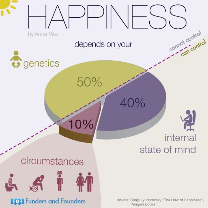50% - Yếu tố di truyền (Set point): Vâng chính xác là 50%. Mỗi người có một “mức hạnh phúc cơ bản” phần lớn được quyết định bởi gen. Nó giống như một điểm cân bằng tự nhiên - sau khi trải qua biến cố lớn (trúng số, mất mát), ta thường quay trở lại gần mức này.