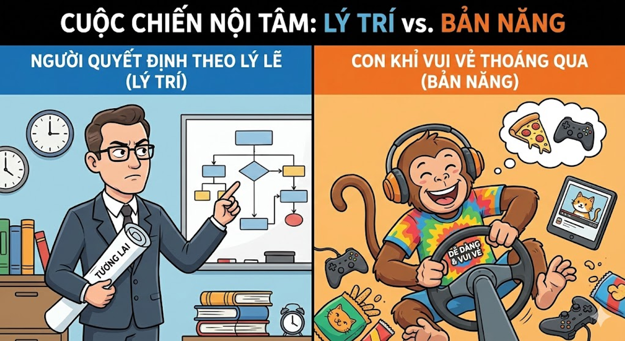 Ngược lại, Con Khỉ Vui Vẻ Thoáng Qua (Bản năng) lại hoàn toàn khác. Nó không có trí nhớ về quá khứ, không có khái niệm về tương lai. Thế giới của nó chỉ xoay quanh đúng hai tiêu chí: Dễ dàng (Easy) và Vui vẻ (Fun).