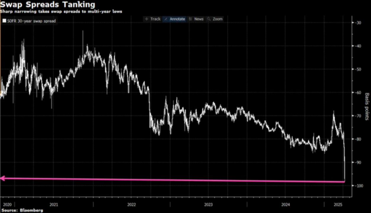 Một chỉ dấu khác của sự gia tăng basis trade chính là diễn biến bất thường của thị trường hoán đổi lãi suất (swap). Swap spread kỳ hạn 30 năm – chênh lệch giữa lợi suất trái phiếu kho bạc và lãi suất hoán đổi – đã rơi xuống mức âm gần 100 bpts, thấp nhất kể từ khủng hoảng năm 2020.