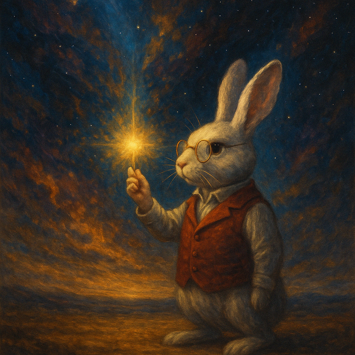 Con thỏ giơ bàn tay lên. Trong lòng tay ấy lóe sáng hàng triệu ảo ảnh, nơi vẻ đẹp và nỗi kinh hoàng đan quyện vào nhau.