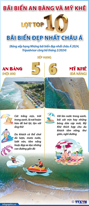 Trong giải thưởng Travelers' Choice Awards 2024, hai bãi biển của Việt Nam là An Bàng (Hội An) và Mỹ Khê (Đà Nẵng) đã xuất sắc chiếm vị trí thứ 5 và thứ 6 trong danh sách những Bãi biển đẹp nhất châu Á. Đây là một sự công nhận đáng tự hào, bởi giải thưởng "Best of the Best" chỉ vinh danh 1% các địa điểm hàng đầu trong số 8 triệu hồ sơ được niêm yết trên nền tảng này.