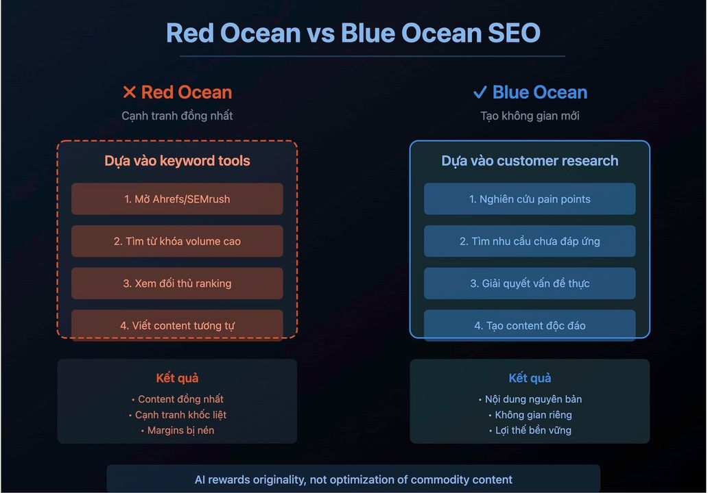Thay vì cạnh tranh trên cùng từ khóa với hàng trăm đối thủ, một số doanh nghiệp đang chuyển sang chiến lược Blue Ocean trong tối ưu tìm kiếm AI: tạo nội dung từ nhu cầu thực của khách hàng thay vì dựa vào dữ liệu từ công cụ phân tích. Tiếp cận này mang rủi ro cao hơn nhưng tạo ra lợi thế cạnh tranh bền vững.