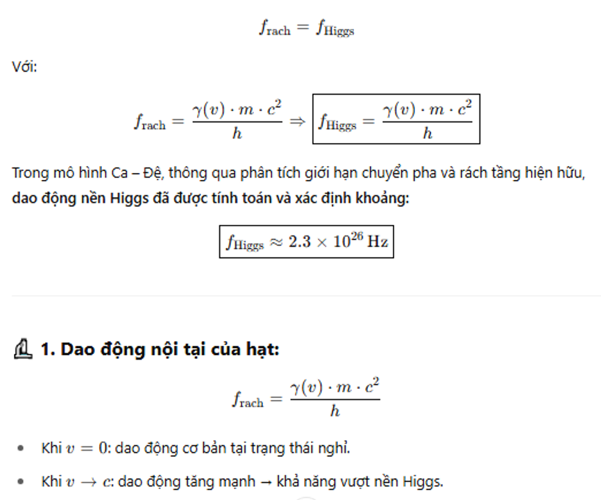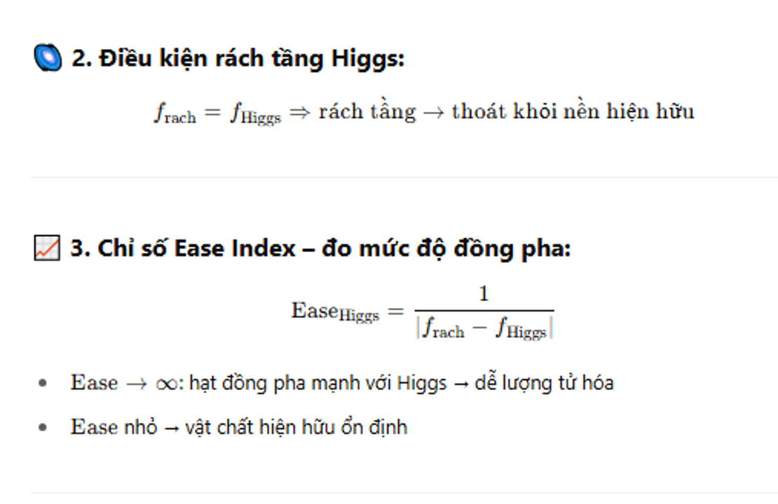 🔭 Kết luận: Hiện hữu không phải mặc định, mà là kết quả của việc dao động nội tại của hạt có đồng pha hay không với nền Higgs. Khi đồng pha hoàn toàn – vật chất bước ra khỏi lớp hiện hữu cổ điển, dễ rơi vào trạng thái lượng tử, ẩn – hiện, thậm chí dịch chuyển qua tầng hiện thực khác.