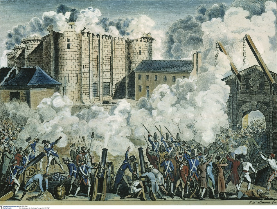 Ngày 14 tháng 7, các công dân thành Paris, nghe được tin Hội nghị Quốc ước xuất hiện và nhà vua đang cử lính đến để dẹp Hội nghị đã tập hợp lại với nhau để bảo vệ bản thân và Hội nghị Quốc ước. Tuy nhiên, họ vẫn thiếu súng cùng các loại vũ khí khác. Vậy nên họ nhanh chóng đến Bastille - 1 pháo đài vương thất với rất nhiều súng đạn, và cũng là ngục tù được nhà vua dùng để giam các tù nhân chính trị.