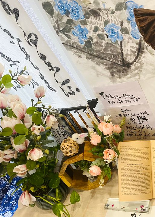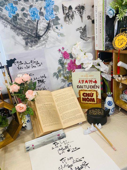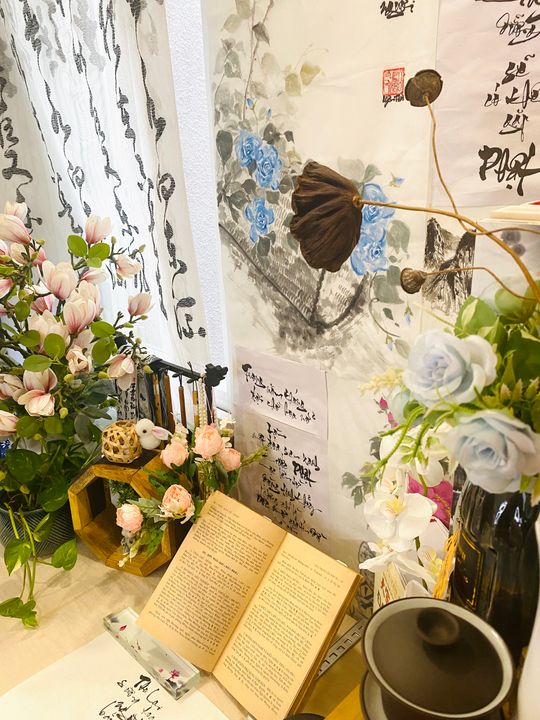 Đây là tổng thể góc nhỏ do mình thiết kế, các tác phẩm thư pháp, thư họa đều do mình vẽ. Chỉ riêng tác phẩm thư pháp chữ Hán là Thầy mình tặng.