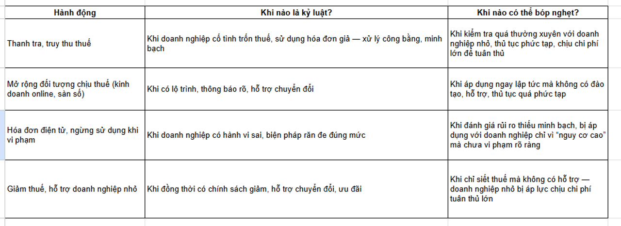 Nhìn tổng thể, chính phủ Việt Nam đang đi theo hướng đúng: tăng cường tính minh bạch, công bằng trong thu thuế, đặc biệt với kinh doanh số, nền tảng thương mại điện tử, hóa đơn điện tử. Điều này là cần thiết để giảm “khoảng trống” kinh tế ngầm và nâng chất lượng quản lý tài khóa.