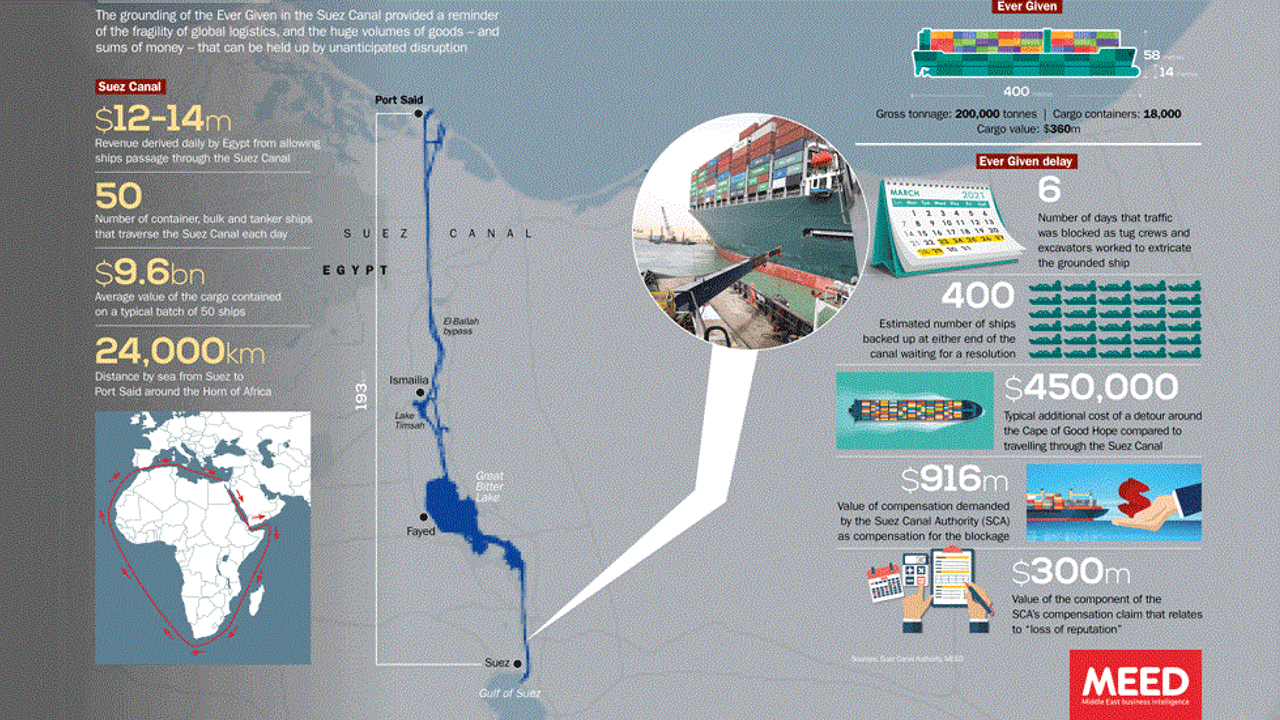 Ngay sau khi được giải cứu, Cơ quan Quản lý Kênh đào Suez đã giam giữ tàu Ever Given tại Hồ Great Bitter và đệ đơn kiện đòi bồi thường đối với chủ tàu Nhật Bản, Shoei Kisen. Yêu cầu ban đầu là một con số đáng kinh ngạc, lên tới 916 triệu USD, bao gồm chi phí cho hoạt động cứu hộ, phí quá cảnh bị mất và một khoản lớn 300 triệu USD cho "tổn thất uy tín".