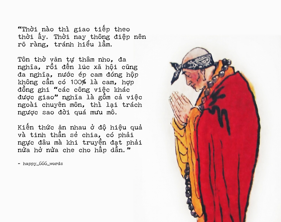 cổ nhân có ngữ cảnh của cổ nhân, hậu thế muốn bắt chước phải nghiên cứu kỹ – xem nghĩa tổng thể của nó trong toàn bộ kinh thư là gì, và còn phù hợp thời thế không. Nếu khó hiểu quá thì cứ dùng các mô hình quản lý công việc/cảm xúc/con người của các tác giả đương thời — viết bằng tiếng mẹ đẻ, kèm ví dụ sinh động. Việc gì phải tìm vui nơi tối tăm ngữ nghĩa. Hơn nữa, thời của cổ nhân có khỉ mẹ gì kinh tế thị trường, văn hóa doanh nghiệp, giáo dục khai phóng đâu?