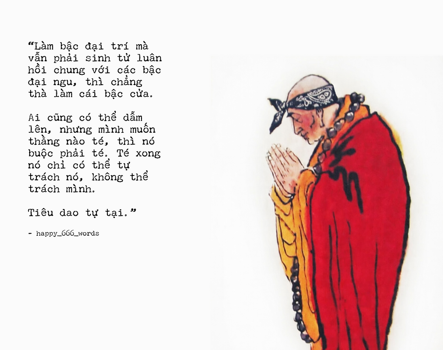 “Cổ nhân nói vậy nhưng không phải vậy, đại trí là phải nói nửa chừng, nếu bạn nghĩ vậy, là bạn chưa thông, bạn phải nghĩ ngược lại, nghĩ chéo qua, nghĩ chàng hảng ra, khi nào mà đúng ý tôi, thì có nghĩa là đúng ý cổ nhân!”