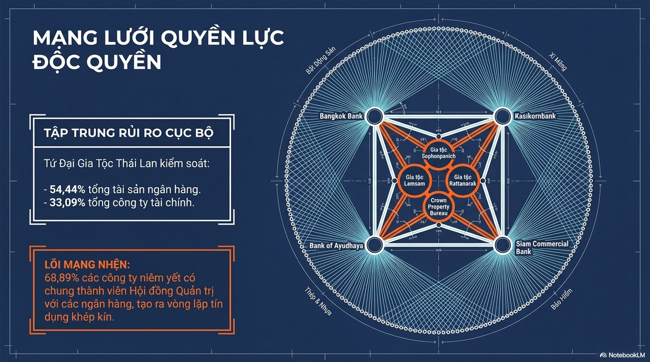 Bốn ngân hàng này chiếm khoảng 54,44% tổng tài sản của toàn bộ ngân hàng thương mại. Các gia đình này cũng kiểm soát 15 công ty tài chính, chiếm khoảng 33,09% tổng số công ty tài chính. Một phần do quy định pháp lý, một phần do quan hệ hôn nhân giữa các gia đình kiểm soát, hệ thống tài chính Thái Lan dần mang cấu trúc độc quyền nhóm ngày càng rõ rệt trong thời gian dài trước khủng hoảng tài chính.