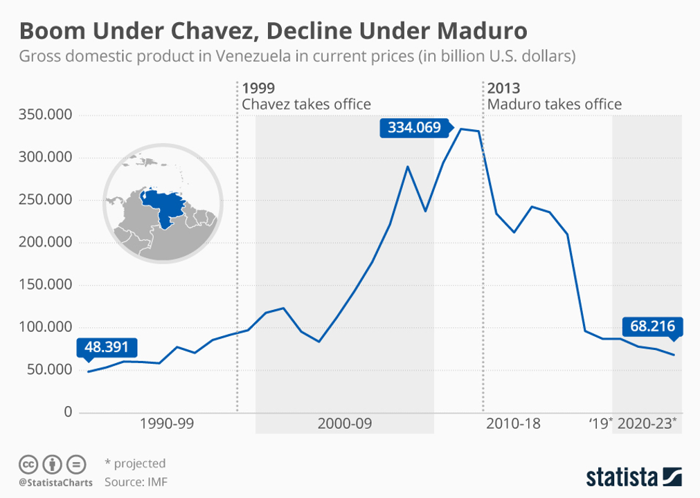 Dưới chính quyền của Maduro, Venezuela đã trải qua một trong những cuộc sụp đổ kinh tế tồi tệ nhất trong lịch sử thế giới thời bình. Trong vòng chưa đầy một thập kỷ: