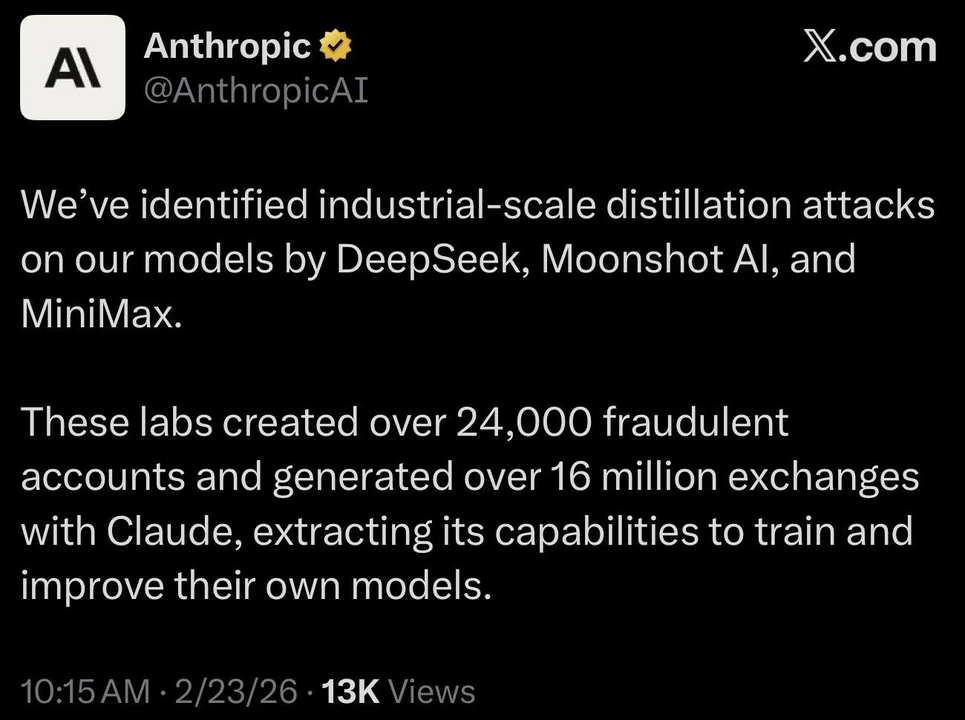 Ngày 23 tháng 2 năm 2026, Anthropic, công ty chủ quản của chatbot Claude, công bố một bài blog dài với cáo buộc gây rung động làng công nghệ là 3 công ty AI hàng đầu Trung Quốc là DeepSeek, Moonshot AI và MiniMax "ăn cắp tri thức" bằng cách họ đã bí mật tạo khoảng 24.000 tài khoản giả, tạo ra hơn 16 triệu cuộc hội thoại với Claude, thu thập toàn bộ câu trả lời rồi dùng để huấn luyện mô hình AI của chính họ.