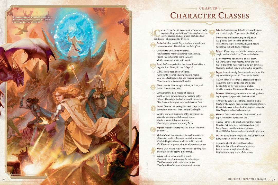 Về lớp nhân vật, cuốn PHB mới vẫn sẽ giữ nguyên 12 class cơ bản từ phiên bản 2014, tuy nhiên sẽ có rất nhiều sự thay đổi ở mỗi class về feature, mechanic hay cả nguồn gốc. Ví dụ như Paladin đã được loại bỏ Divine Smite sử dụng spell slot mà thay bằng Paladin Smite mỗi ngày một lần, giúp cho các hiệp sĩ thánh chiến có nhiều đất diễn hơn với tư cách là một half caster. Trong khi đó, Barbarian đã có subclass Path of the World Tree với khả năng teleport và tăng sức chống chịu của toàn đội. Cá nhân mình nhận thấy các martial class đã được cải thiện vấn đề di chuyển rất nhiều ở level cao, đồng thời khả năng phòng thủ và tấn công cũng được gia tăng. Ngoài ra, các feature và feat ở các level cũng có nhiều sự thay đổi, đáng kể nhất là Pact Boon ở level 19 theo mình thấy đã đưa các lớp nhân vật đạt tới sức mạnh của những vị thần.
