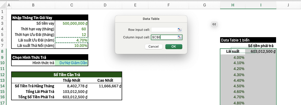 Column input cell: chọn ô chứa lãi suất ưu đãi (ví dụ C6) Vì mình để các lãi suất nằm dọc theo cột, nên dùng Column thay vì Row.