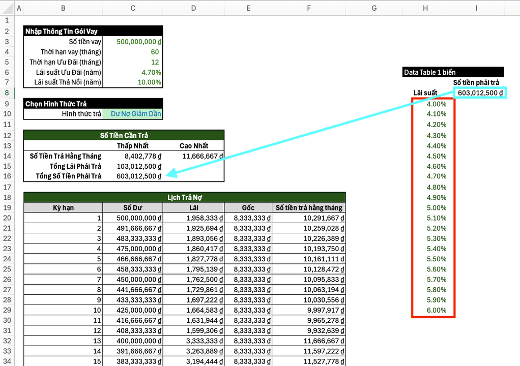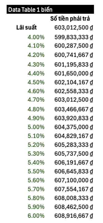 Để tận dụng tối đa sức mạnh của bảng tính này, bạn sẽ cần sử dụng thêm Data Table. Giả sử bạn đang phân vân: mức lãi suất ưu đãi bao nhiêu là chấp nhận được với khả năng tài chính hiện tại? Bạn muốn thử từ 4% đến 6% để xem mỗi mức thay đổi số tiền cần trả như thế nào. Thay vì nhập tay từng con số, Data Table sẽ giúp bạn "chạy" thử nhiều giá trị nhanh chóng.