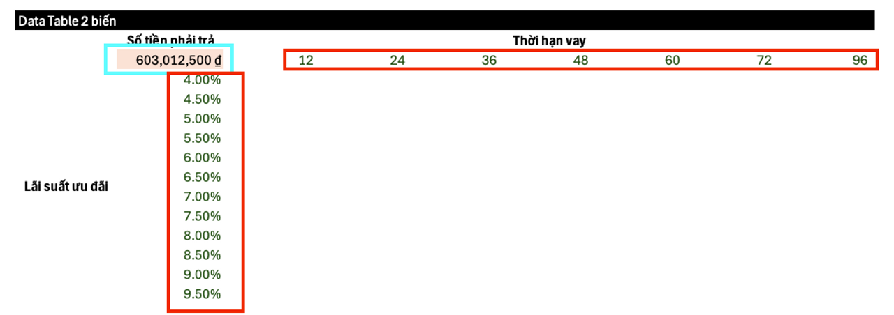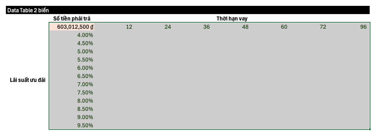 Công cụ Data Table cũng có thể giúp bạn tìm số tiền phải trả tương ứng với từng tổ hợp Lãi suất Ưu đãi và Thời hạn vay.