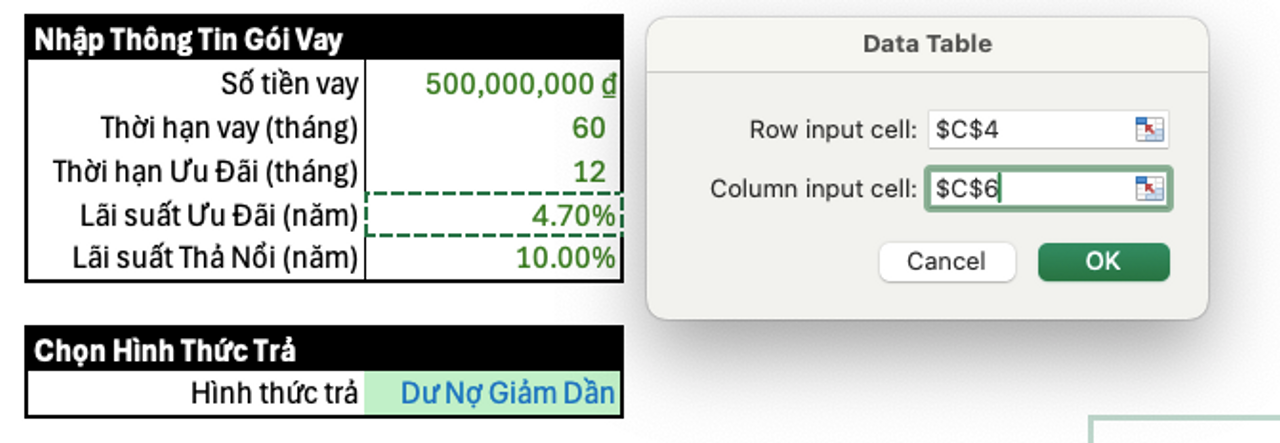 Row input cell: trỏ về ô thời hạn vay Column input cell: trỏ về ô lãi suất ưu đãi