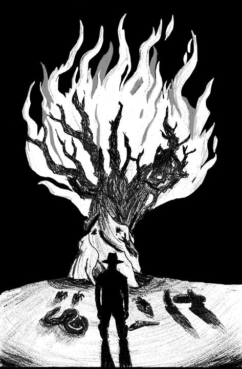 Đó là một cây lẻ loi cháy giữa hoang mạc. Một cây điềm hiệu do cơn bão đã qua làm phát hoả. Người hành hương cô độc đứng trước nó đã đi một chặng đường dài tới đây và cậu quỳ gối trên cát nóng và chìa hai bàn tay tê lạnh còn bên trong vòng tròn đó là những đoàn phò tá hèn mọn bị hút vào ánh mai khác thường, cú nhỏ nép mình trong im lặng và đứng chân kề chân và nhện lông và nhện mặt trời và bọ cạp roi và nhện huyền hung ác và thằn lằn da cườm mõm đen như sư khuyển, nguy hiểm với người, và thằn lằn nhỏ miền hoang mạc phun máu từ mắt và rắn cát nhỏ như những vị thần tề chỉnh, im tiếng và tựa y, ở Jedda, ở Babylon. Một chòm rực những con ngươi viền quanh vầng sáng thảy duy trì sự thuận hoà mỏng manh trước đuốc lửa tỏ ngời che đi những vì sao trong hốc mắt.