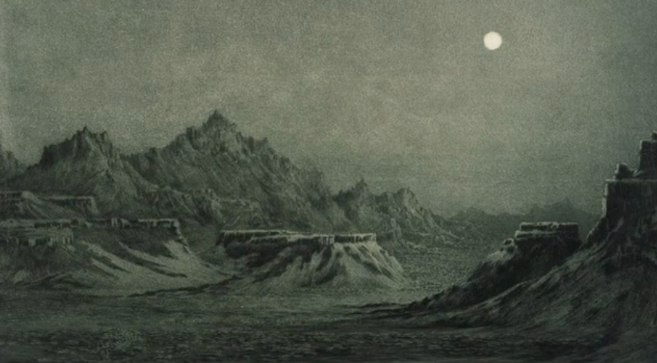 Hầu hết tuyết trên bình nguyên cậu đang đứng đã bay đi hoặc tan chảy. Từng cơn bão dồn dập xuống từ phía bắc và tiếng sấm vang xa dần và bầu không giá lạnh và thoảng mùi đá ướt. Cậu băng qua lòng chảo khô cằn, không gì ngoài những đám cỏ thưa và lác đác cọ lùn đứng cô độc và im lặng dưới bầu trời u ám như những gì khác đành phải ở đó. Phía đông những ngọn núi sừng sững tối đen giữa hoang mạc và trước mặt cậu là vách đứng hay doi đất nhô ra như mũi biển hùng vĩ và âm u trên nền hoang mạc. Cậu bước đi nặng nề, nửa đóng băng, hai chân mất cảm giác. Cậu đã nhịn đói gần hai ngày và cậu nghỉ rất ít. Cậu ghi nhớ địa hình trước mặt mỗi lần loé tia sét và lê bước tiếp và cứ như vậy cậu vòng qua một mỏm đá u tối bên phải và dừng bước, run bần bật và thổi vào hai bàn tay co quắp tê liệt. Phía xa trước mắt cậu một ngọn lửa rực cháy trên thảo nguyên, một ánh lửa cô độc bập bùng theo gió hồi mạnh hồi yếu và phóng tia sáng vào cơn bão như bụi nóng thổi ra từ một lò rèn khôn tả đang gầm rú giữa vùng hoang. Cậu ngồi quan sát. Cậu không ước tính được là nó bao xa. Cậu nằm sấp toan nhờ ánh nắng soi địa hình để xem ai ở đó nhưng trời và nắng không còn nữa. Cậu nằm đó rất lâu quan sát nhưng không có gì cử động.