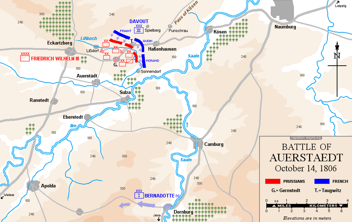 Theo mệnh lệnh của Hoàng đế nhận được vào sáng sớm ngày 14 tháng 10, Davout phải tiến mạnh về phía tây — sẵn sàng cắt đứt đường rút lui của quân Phổ về phía Magdeburg hoặc bao vây sườn và hậu phương của kẻ thù gần Apolda. Bernadotte đáng lẽ phải ở gần Dornburg, nằm giữa đường đến Jena, nhưng trong tái bút nổi tiếng của Hoàng đế Pháp lúc 10 giờ tối có viết rằng: