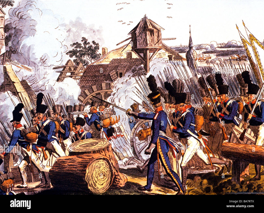 May mắn cho Gudin, sư đoàn thứ hai và thứ ba của Phổ đã bị kẹt cứng với các đoàn xe hành lý hướng lên phía bắc, vì vậy đến 8 giờ sáng, chỉ có chín tiểu đoàn của Schmettau, 12 phân đội của Blucher, thêm bốn phân đội bảo vệ sườn và 24 khẩu pháo là ở đúng vị trí. Những cuộc tấn công nóng nảy đầu tiên của Blucher — được thực hiện trước khi bộ binh Phổ kịp lên — không tạo được ấn tượng gì đối với các khối vuông do các lữ đoàn của Gautier và Petit lập ra, và kỵ binh địch phải lùi lại để chỉnh đốn đội hình. Cả Vua Phổ và Công tước xứ Brunswick đều có mặt trong cuộc giao tranh nổi tiếng này.