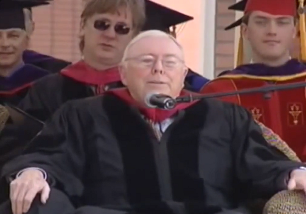 Bất kể lý do là gì, tôi nghĩ việc tôi là người nói ở đây khá là phù hợp. Bởi tôi có thể nhìn thấy đám đông những người lớn tuổi ở phía sau, không mặc áo choàng tốt nghiệp. Và tôi hiểu, từ việc giáo dục cả một đội quân con cháu, ai là người thực sự xứng đáng với sự vinh dự hôm nay được trao cho những sinh viên đang mặc áo choàng ở phía trước. Những hy sinh, trí tuệ, và giá trị truyền lại từ thế hệ này sang thế hệ khác nên luôn luôn được trân trọng.