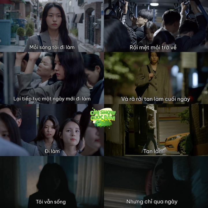 Ở đây, sự ngột ngạt của đô thị không chỉ đến từ công sở mà còn từ hành trình đi làm lặp lại, kéo dài cảm giác vô nghĩa.