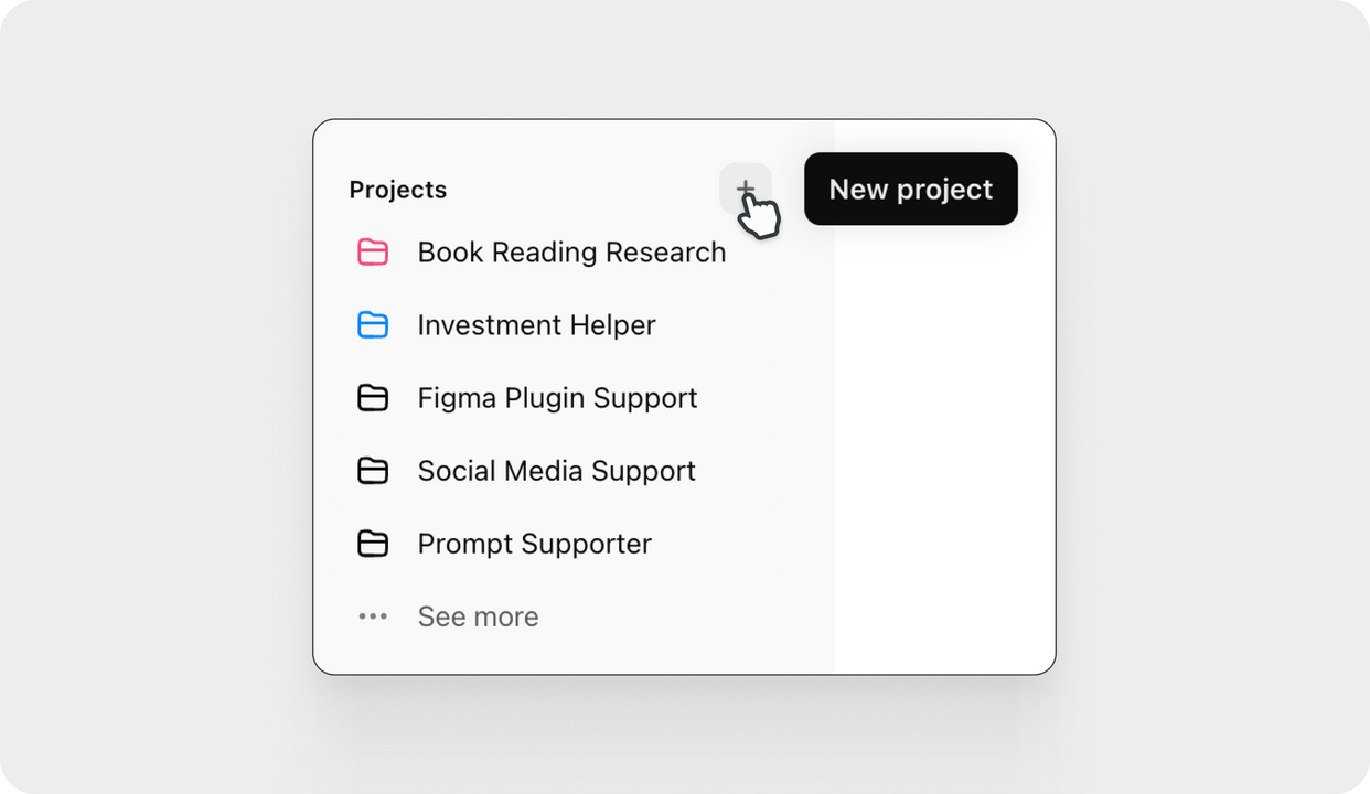 Nhìn vào thanh sidebar bên trái của ChatGPT. ---> Di chuột đến tiêu đề "Project", bạn sẽ thấy xuất hiện dấu "+" bên phải tiêu đề. ---> Nhấn vào dấu "+" để bắt đầu tạo Project mới ---> Đặt tên cho Project.