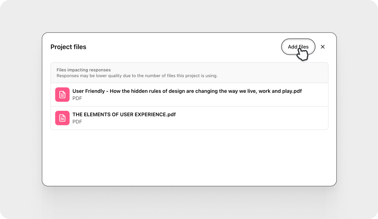 Bạn có thể thêm vào file thông tin của dự án, chẳng hạn như yêu cầu (requirement), nghiên cứu người dùng (user research), tài liệu thiết kế (design document), hoặc báo cáo phân tích (analysis report), để AI hiểu rõ hơn về dự án của bạn, từ đó đưa ra những giải pháp phù hợp hơn.