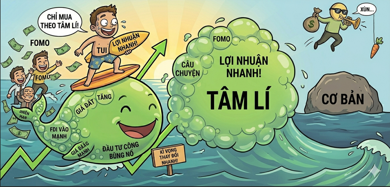 Các chuyên gia, broker bắt đầu phân tích, báo chí bắt đầu vẽ lên những câu chuyện hưởng lợi "Giá đất chỉ có tăng" "Đầu tư công sắp bùng nổ" "FDI vào mạnh, khu công nghiệp sẽ tăng" v.v...