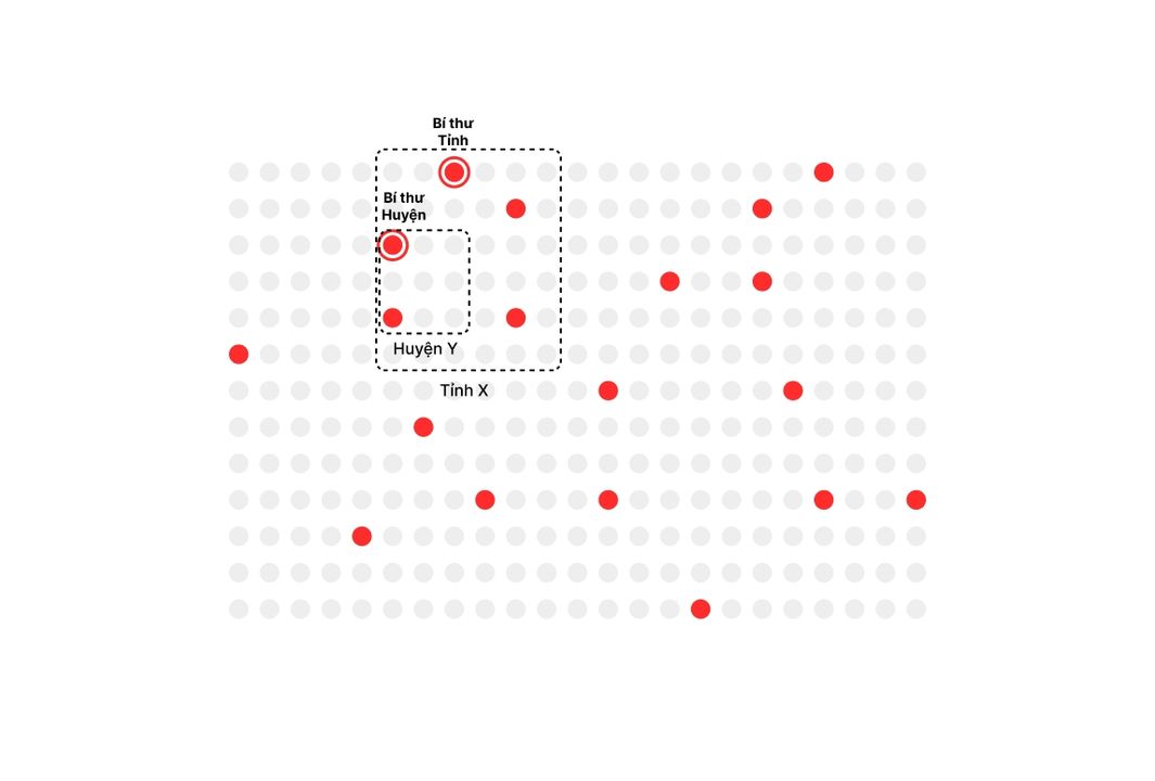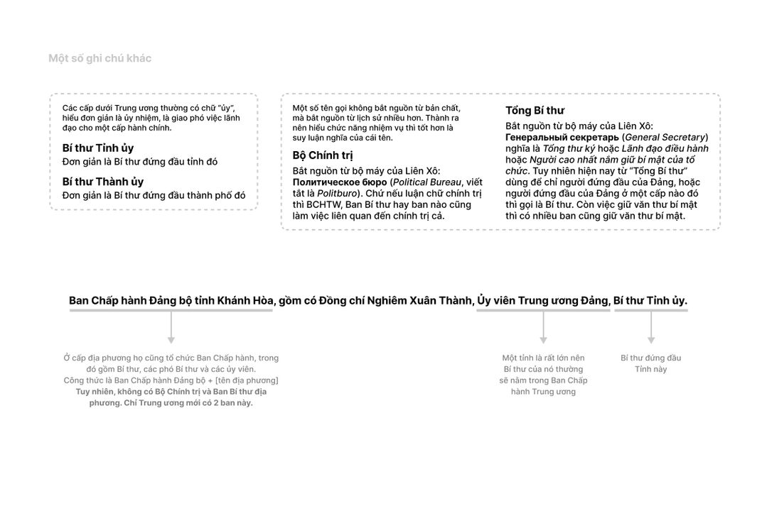 Họ chia khu chia cấp ra. Ai đứng đầu quản lý Đảng viên một cấp sẽ gọi là Bí thư (người giữ văn thư bí mật, quan trọng). Ví dụ Bí thư tỉnh Khánh Hòa, bên dưới có Bí thư huyện Cam Lâm, hay trong trường ĐH có Bí thư Đoàn (cầu nối của Đảng).