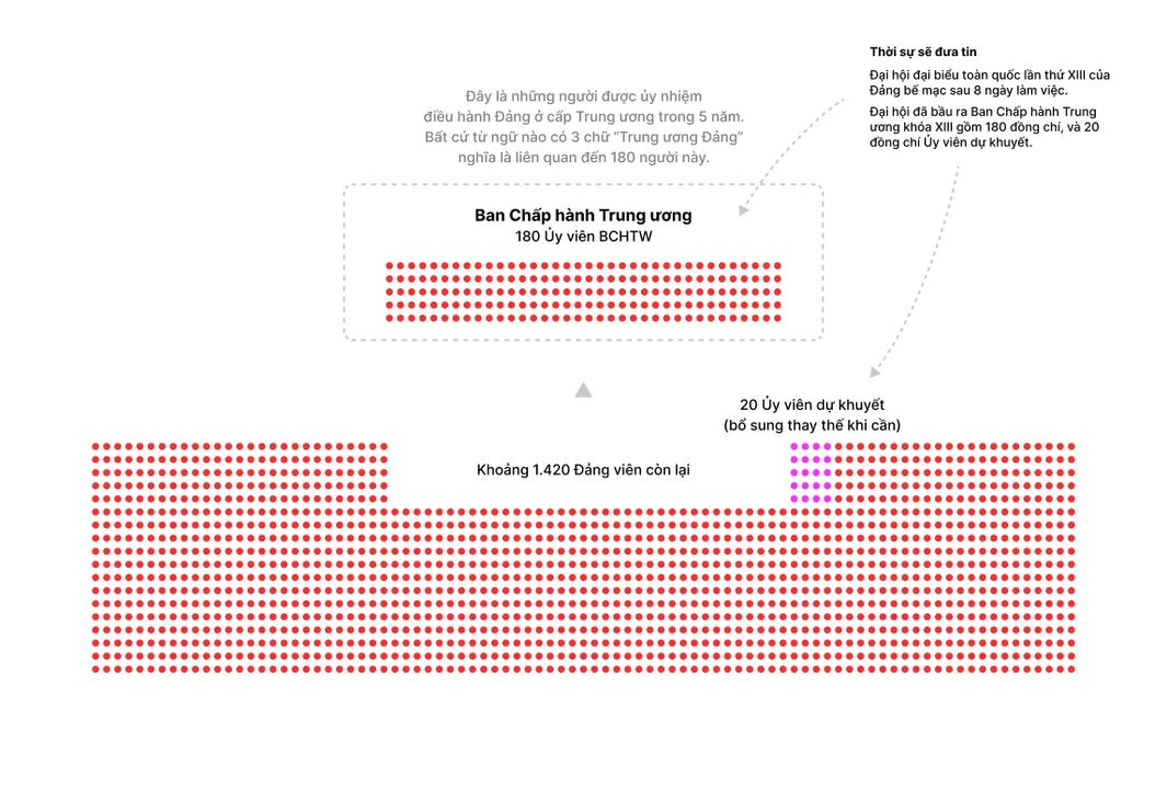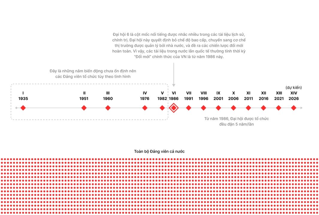 Cứ 5 năm, toàn bộ Đảng viên họp lại, bàn kế hoạch phát triển đất nước và bầu lại các nhân sự quyền lực. Đây gọi là Đại hội Đảng. Hết 5 năm, họ tổ chức lại. VN hiện đang ở cuối kỳ hạn 5 năm thứ 13. Đại hội 14 sẽ diễn ra đầu năm 2026.