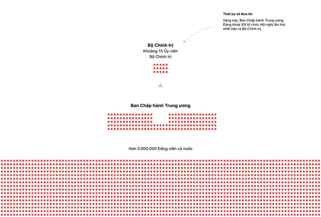 Tuy nhiên, hằng ngày quốc gia còn rất nhiều chuyện như bão lụt, ngoại giao, tham nhũng… cần họp thường xuyên và ra quyết định nhanh. Vậy là BCHTW bầu ra một nhóm nhỏ hơn nữa, khoảng 15 người, gọi là Bộ Chính trị. Những người này được gọi là Ủy viên Bộ Chính trị. Vậy ban nhỏ xíu này chính là những người quyền lực nhất và các đại tướng.