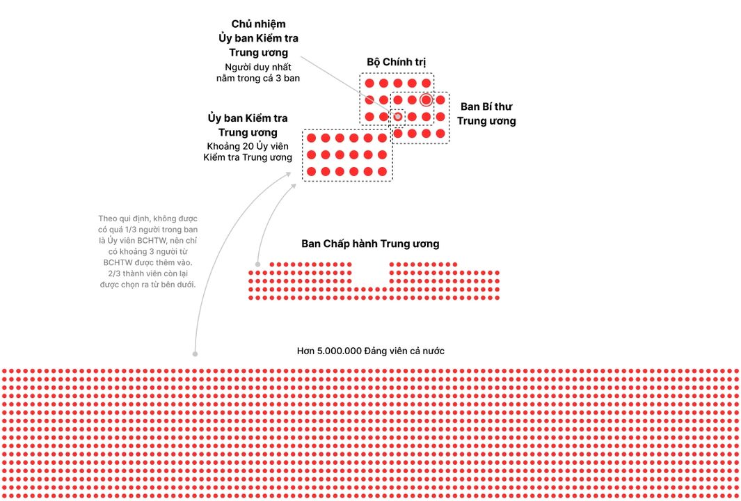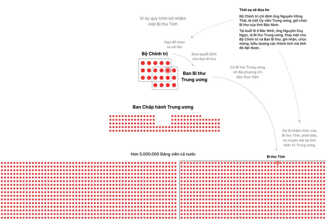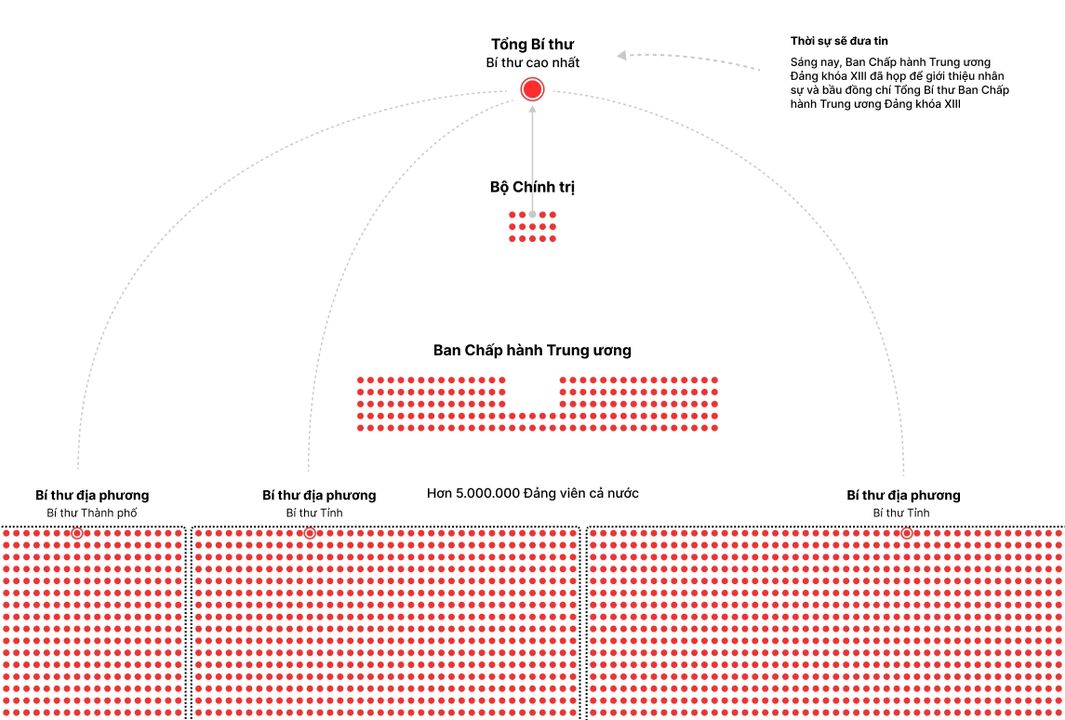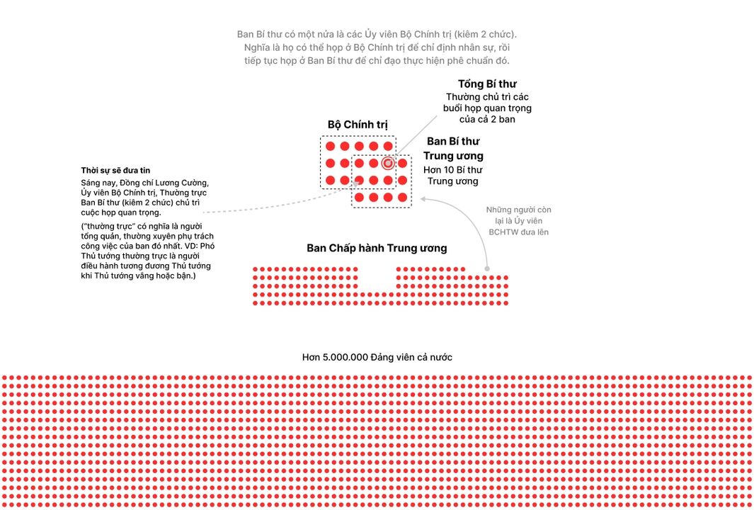 Một người trong Bộ Chính trị sẽ làm Tổng Bí thư, là Bí thư cao nhất. Người này đại diện chính thức cho toàn Đảng Cộng Sản VN.