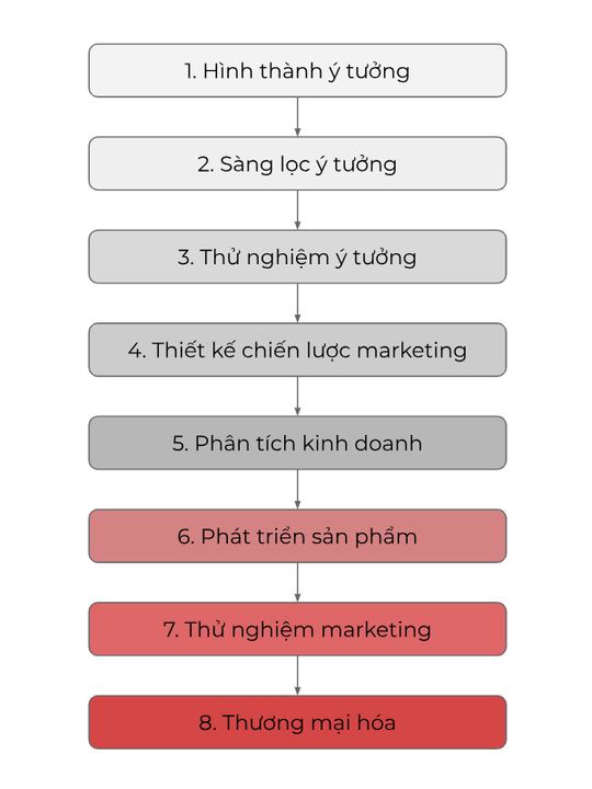 Sau tất cả, dù là sự sáng tạo bay bổng hay những bước cải tiến thiết thực, mọi thay đổi đều cần được định hướng bởi một bộ khung quy trình hệ thống. Những rủi ro về định vị sai lệch hay sự thiếu tương thích với thị trường sẽ luôn là gánh nặng nếu chúng ta không chuẩn bị bài bản từ đầu. Một tiến trình phát triển sản phẩm rõ ràng lúc này đóng vai trò như chiếc la bàn, giúp bạn lọc lựa những ý tưởng thực sự giá trị để chinh phục khách hàng. Tiến tình này với tám bước chính được diễn giải như hình bên dưới.