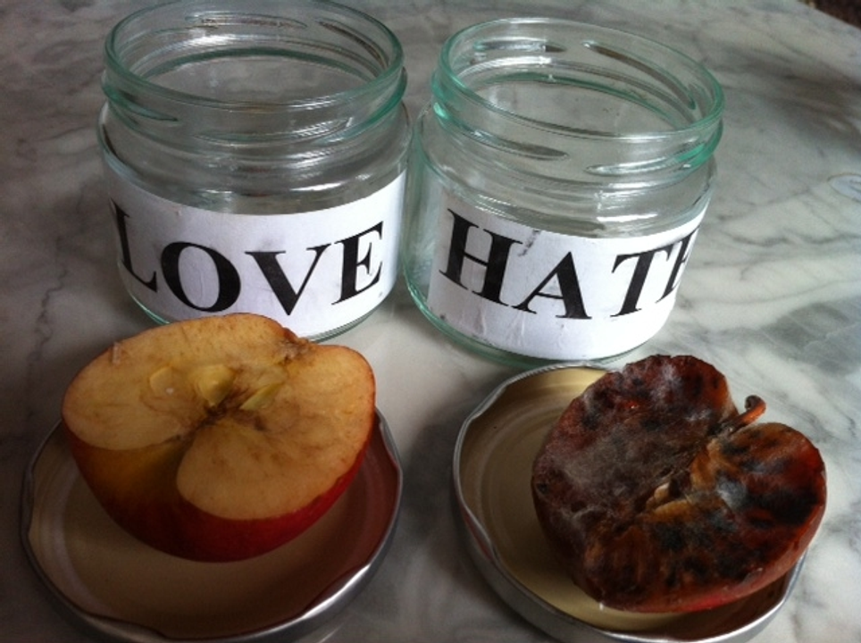 Thông tin này đơn giản nói rằng nếu bạn bỏ táo vào 2 hộp thủy tinh khác nhau và dán 1 hộp chữ Love (yêu thương), còn hộp kia chứ Hate (Ghét), thay hai từ này bằng tiếng Việt hoặc ngôn ngữ khác cũng được, rồi nói 2 từ này hằng ngày với hai hộp, thì sau một thời gian một trái táo còn nguyên, còn 1 trái táo bị hỏng. Câu hỏi là bạn đã thử chưa? Đơn giản vậy sao?