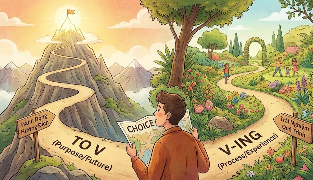 V-ing (Gerund): Thường mang sắc thái của việc đã xảy ra (quá khứ), sự tận hưởng, hoặc sở thích chung chung.