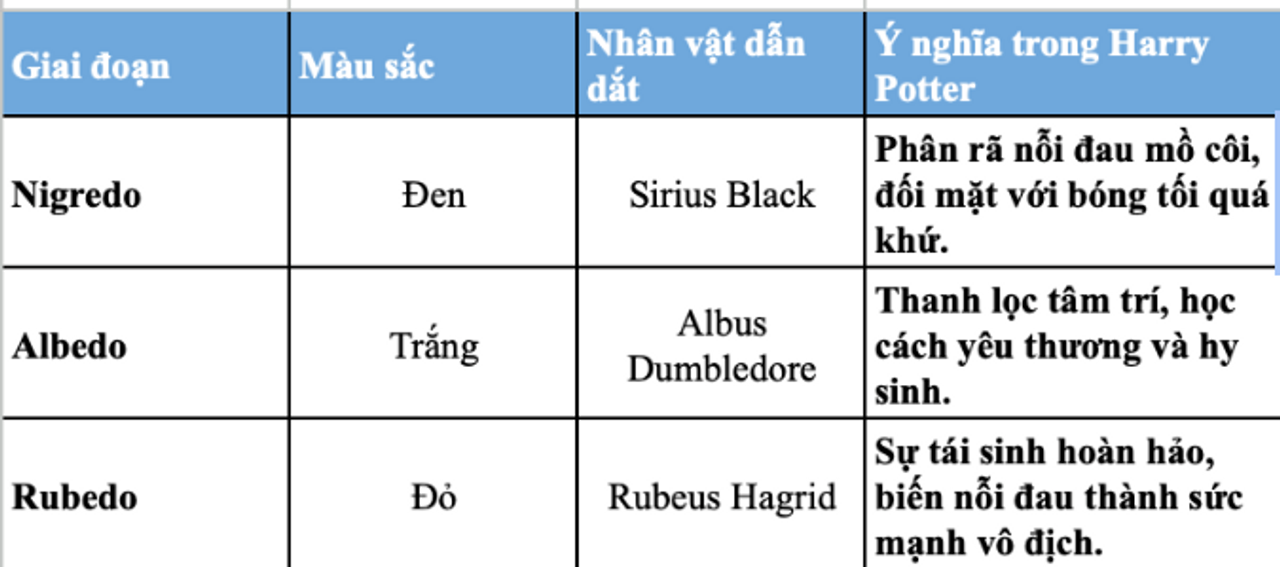 Trong Giả kim thuật, quá trình luyện kim (Magnum Opus) bắt buộc phải đi qua ba màu sắc chủ đạo: Đen (Nigredo) -> Trắng (Albedo) -> Đỏ (Rubedo). Và nhìn xem, Rowling đã "nhét" ba giai đoạn này vào ba nhân vật quan trọng nhất quanh Harry: