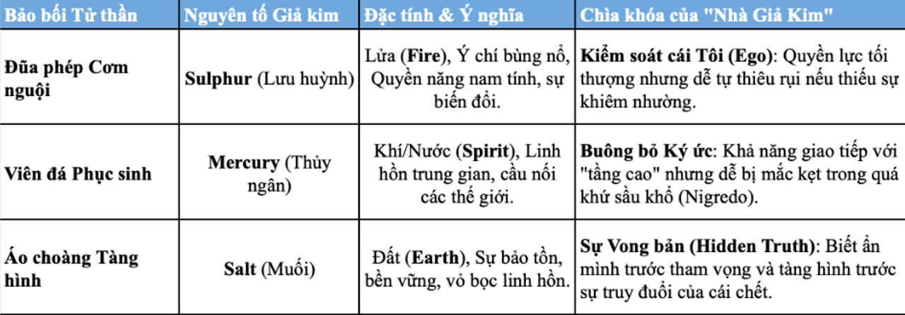 "Kẻ trở thành Chủ nhân Tử thần không phải là kẻ sở hữu ba món đồ chơi mạnh nhất. Đó là kẻ đã đạt được trạng thái Cân bằng hoàn hảo của bộ ba: Ý chí (Sulphur) mạnh mẽ, Linh hồn (Mercury) thấu suốt và Thân thể/Sự ổn định (Salt) bền bỉ. Harry Potter thắng Voldemort vì cậu sở hữu cái Áo choàng (Muối) thứ duy nhất giúp cậu 'tàng hình' trước cái Tôi tham lam, trong khi Voldemort chỉ khao khát cái Đũa phép (Lưu huỳnh) để rồi tự thiêu rụi chính mình."