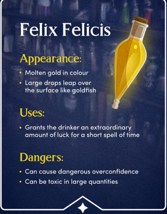 Phúc Lạc Dược (Felix Felicis) Vàng lỏng (Liquid Gold): Anh em để ý dung dịch này có màu gì không? Màu Vàng Kim rực rỡ, và khi đun trong vạc, nó nhảy lách tách như có sinh mệnh riêng.